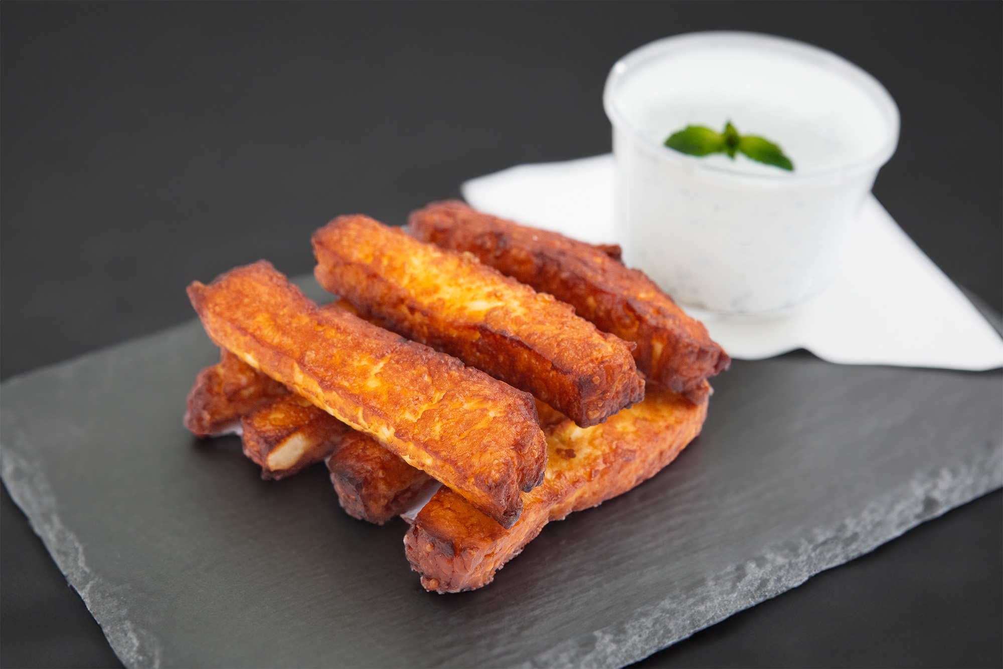 220g; Branza grill tip halloumi prajita 170g, servita cu sos tzatziki 50g, 1E