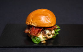 300g; Chifla briosa 70g, carne de vita Black Angus 135g, cascaval emmental 20g, ceapa prajita, salata iceberg, castraveti murati 20g, sos Barbeue 20g. 2E