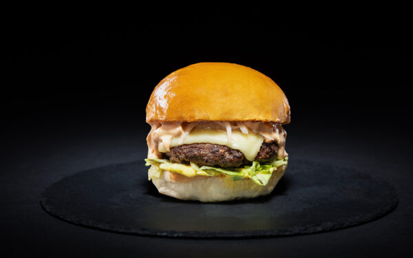 300g; Chifla briosa 70g, carne de vita Black Angus 135g, cascaval emmental 20g, ceapa prajita, salata iceberg, castraveti murati 20g, sos Barbeue 20g. 2E