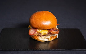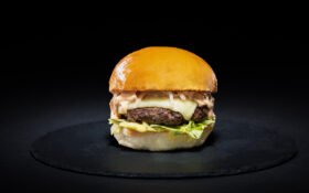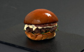 Chifla briosa 70g, carne de vita Black Angus 135g, branza de capra 40g, salata valeriana, portocala caramelizata 40g, sos „Burger Van” 20g. 5E